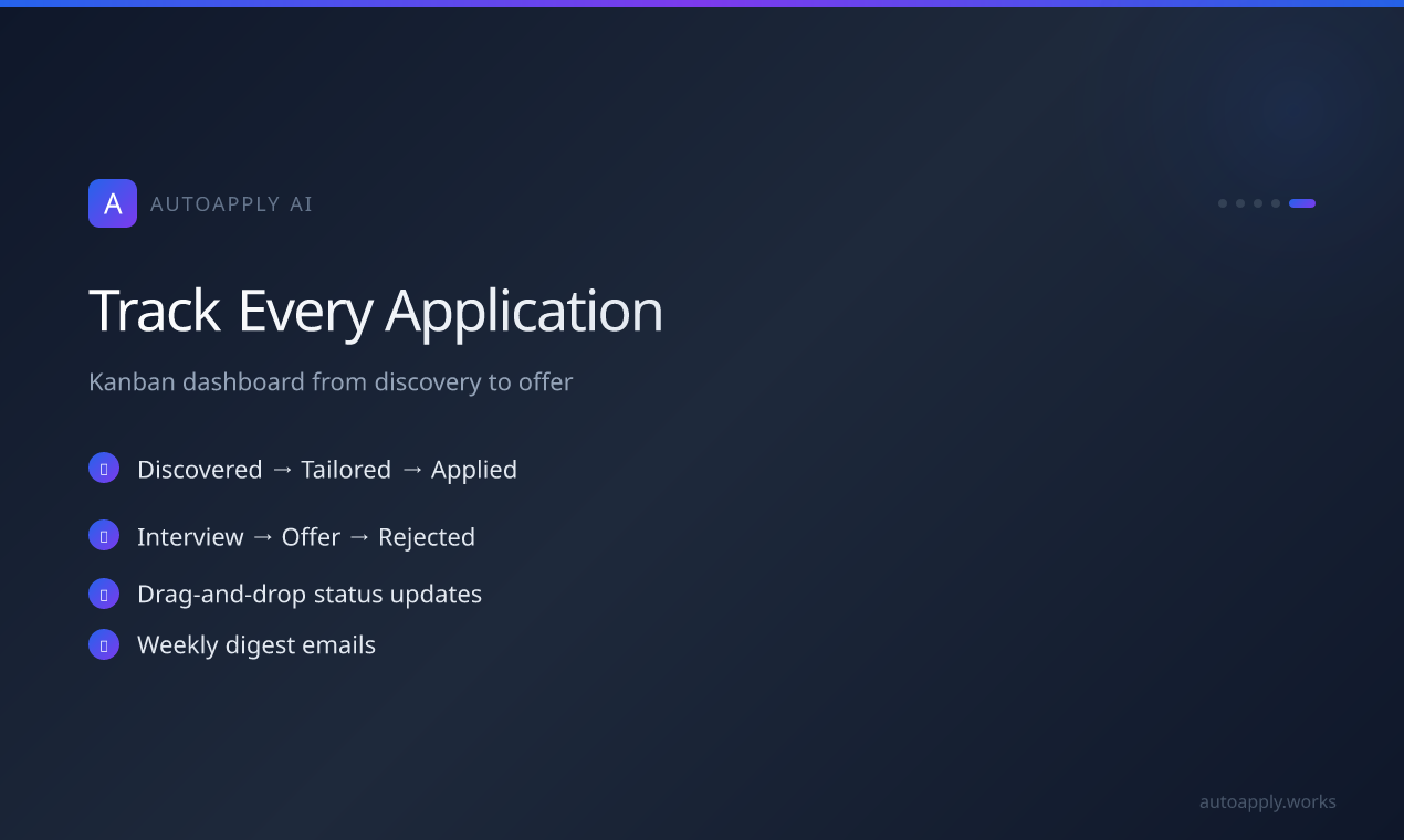 Stop sending the same generic CV to every job. AutoApply AI tailors your CV and cover letter for each position — in seconds, not hours. Upload your CV once. Paste any job description. Get a tailored CV + cover letter instantly. AI never fabricates — only rephrases YOUR real skills. ATS keyword optimization. Job discovery from 5+ sources. Kanban board to track applications. 5 languages. Free to start. Pro from $29/mo. GDPR-compliant.