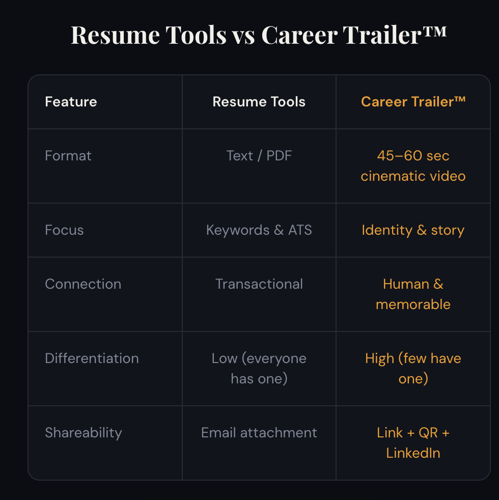 Career Trailer™ turns your experience into a cinematic 30–60 second trailer that helps you stand out, feel seen, and earn more interviews.