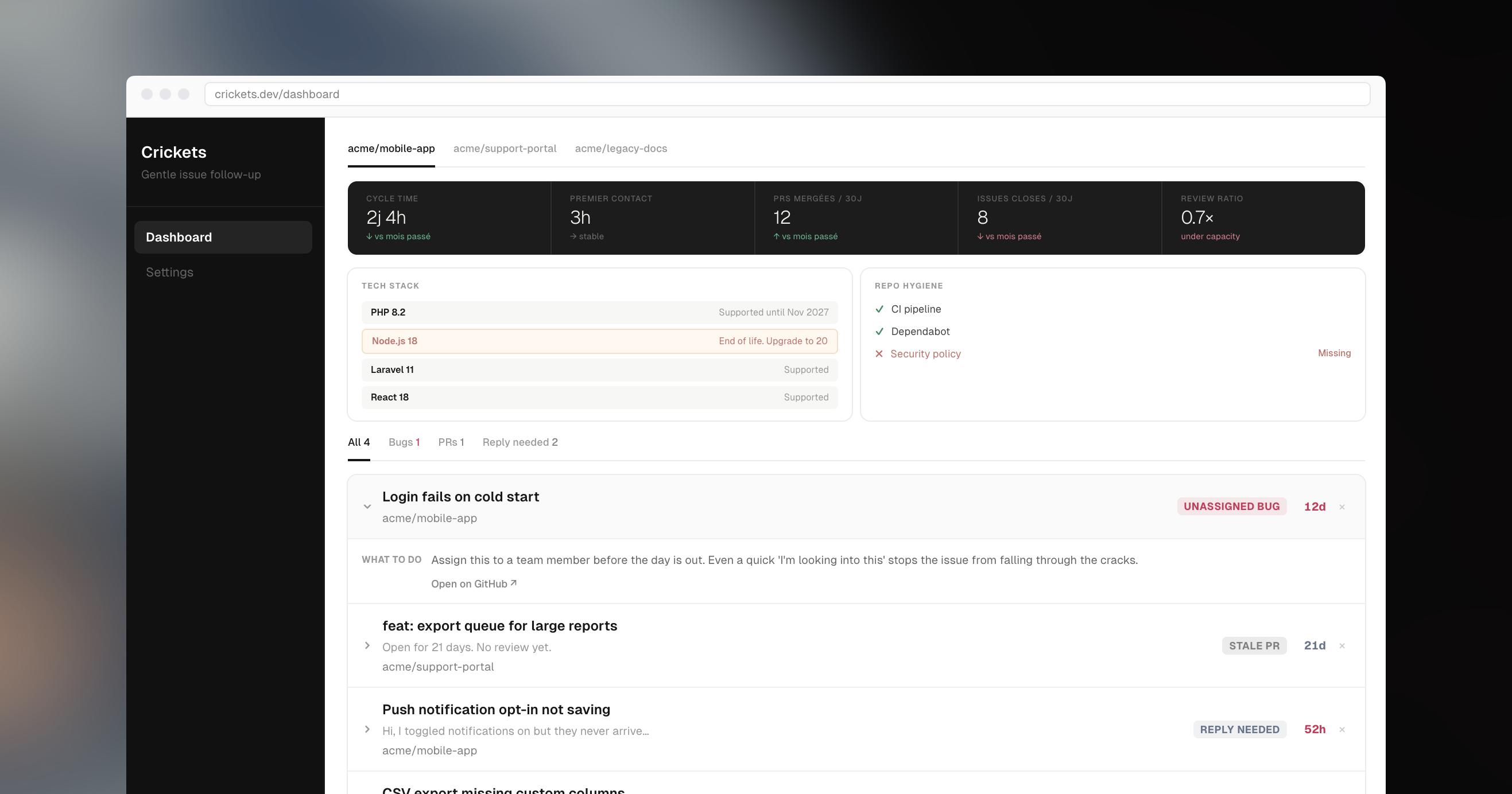 Crickets serves as the daily dashboard for engineering managers and technical leads. Link your GitHub organization to identify areas requiring focus, such as unassigned bugs, stagnant pull requests, awaiting responses, inactive issues, and production errors without tickets. It also displays tech stack versions, bus factor, and repository health. Open the dashboard, review any blockers, and close the tab. No modifications to code, no agents, and no unnecessary distractions.