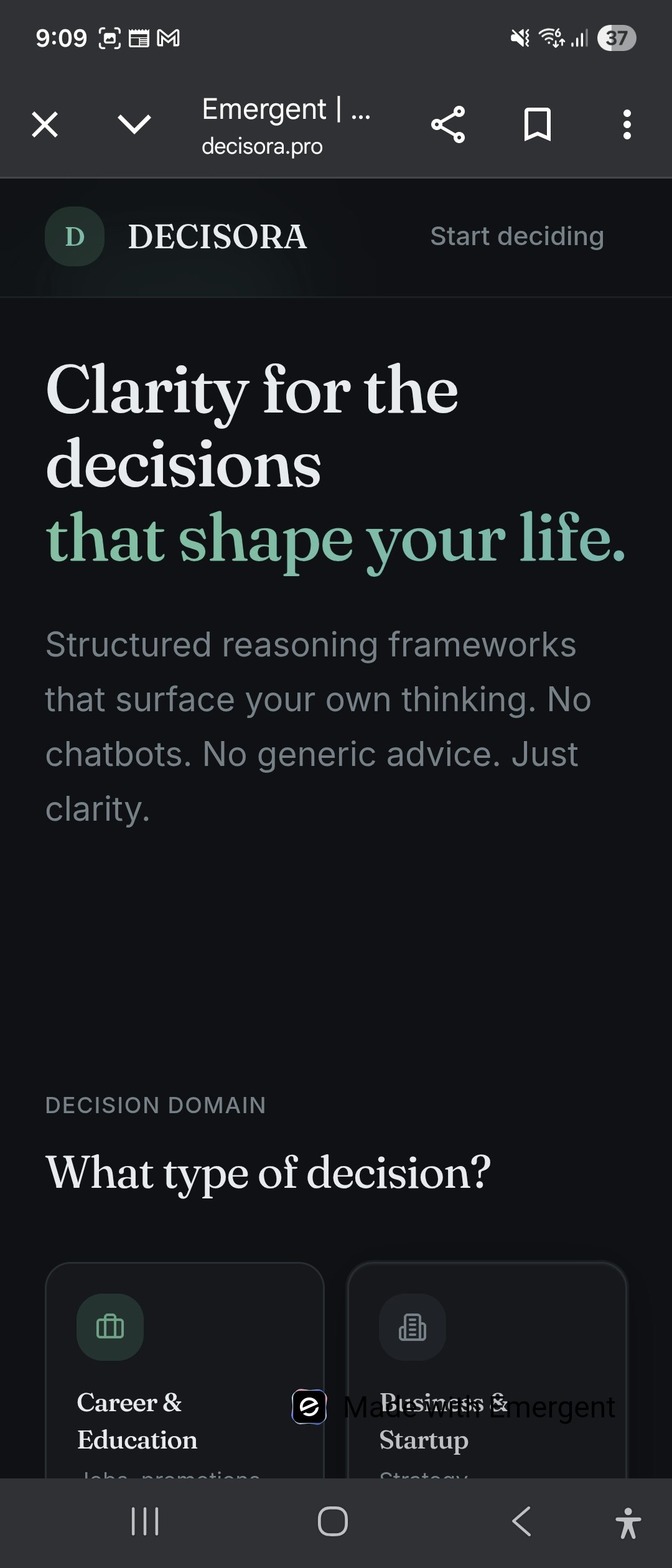 Many AI tools focus on providing rapid responses. However, meaningful choices require deliberate and structured thought. Decisora guides you toward clear thinking by applying established frameworks such as 10-10-10, inversion, opportunity cost, and first principles. The platform delivers not just answers, but a thorough consideration of trade-offs, risks, and clarity to inform your decision. It is designed for significant choices in your career, finances, business, and personal life. Decisora acts as a thinking partner, not merely a chatbot. It now includes PayPal support for global payments to serve international users.