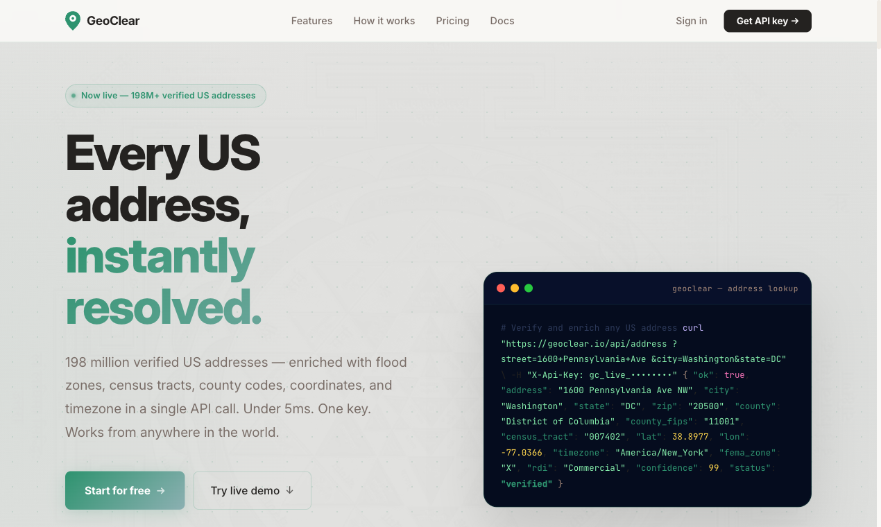 GeoClear provides FEMA flood zones, census tract information, county FIPS codes, RDI data, and timezone details for any US address through one API call. It covers over 198 million addresses. A free tier offers 10,000 monthly calls with no credit card required, while paid plans start at $49 per month. There is no need to separately combine the Census Bureau geocoder and the FEMA NFHL API, as we have completed that integration. You receive a single, clean JSON response. The service is built on data from USDOT NAD, Overture Maps, FEMA NFHL, and the US Census Bureau.
