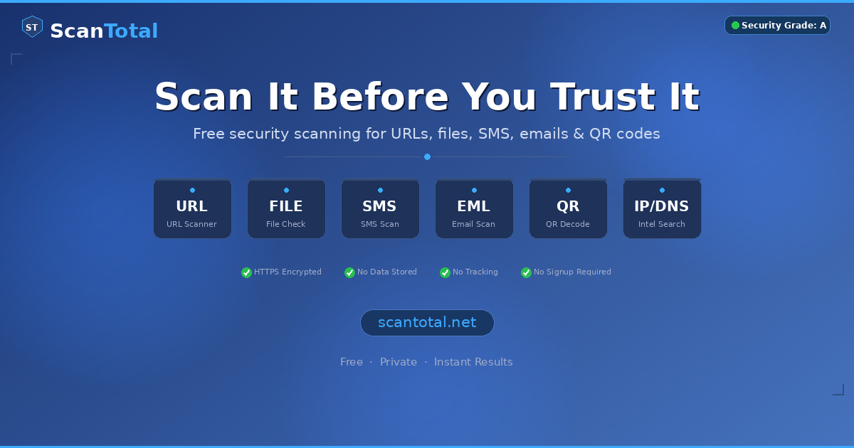 ScanTotal lets anyone check if a link, file, text message, email, or QR code is safe — instantly. No signup, no tracking, no data stored. Built for everyday people, not just security experts