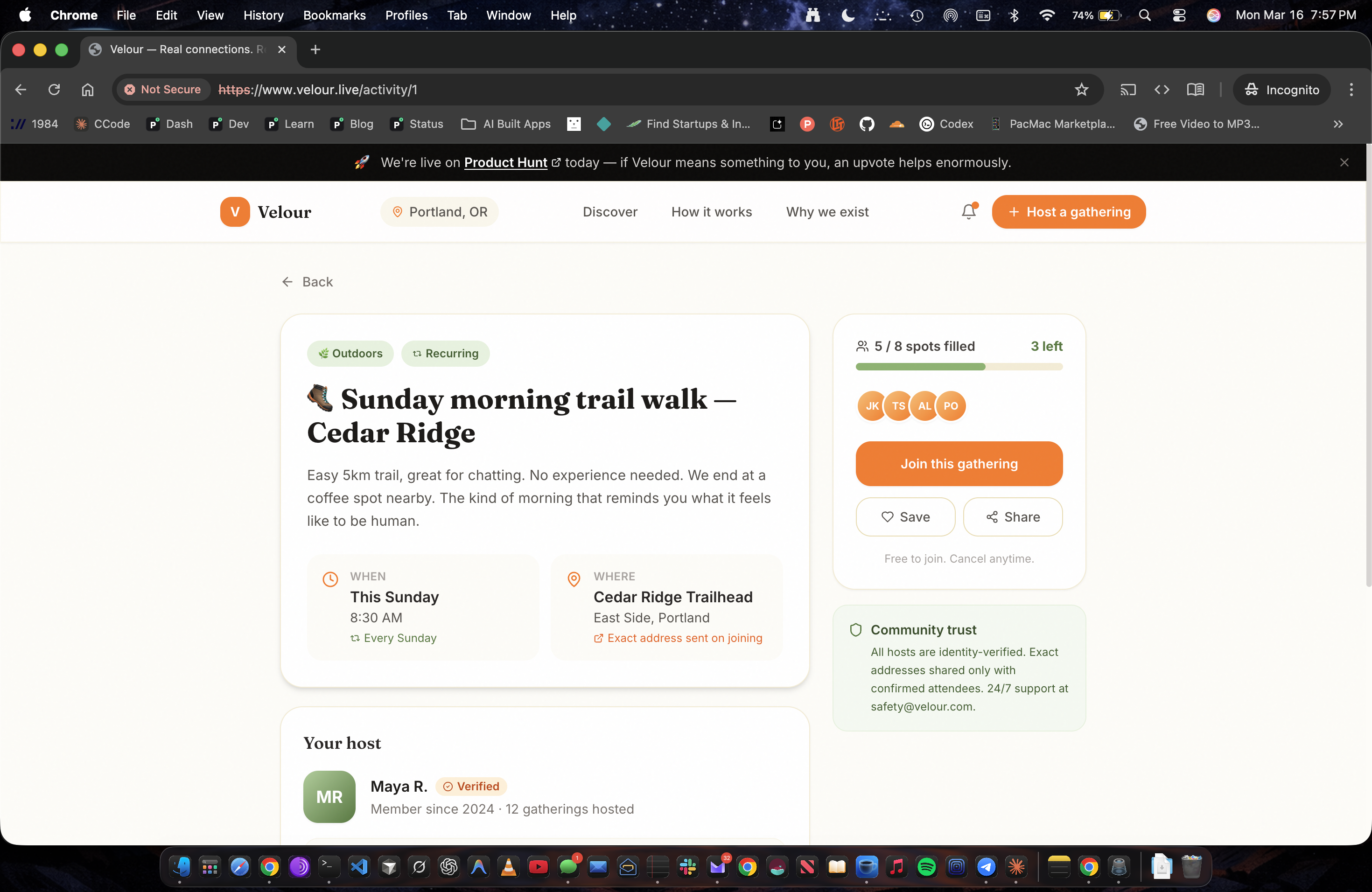 The Surgeon General called loneliness an epidemic. We built an answer. Velour finds real people doing real things near you — hiking, cooking, board games, yoga — in person, in your city. No algorithm. No feed. No followers. Just small groups (max 12) showing up together. Because 847 connections online doesn't mean you have someone to grab dinner with.